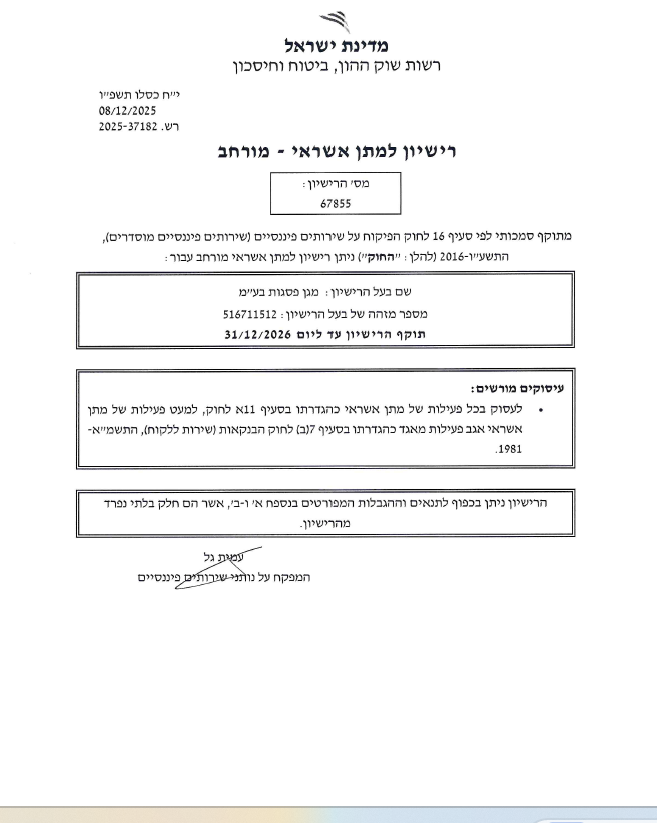 מגן פסגות - בעלת רישיון למתן אשראי מורחב - מספר 67855